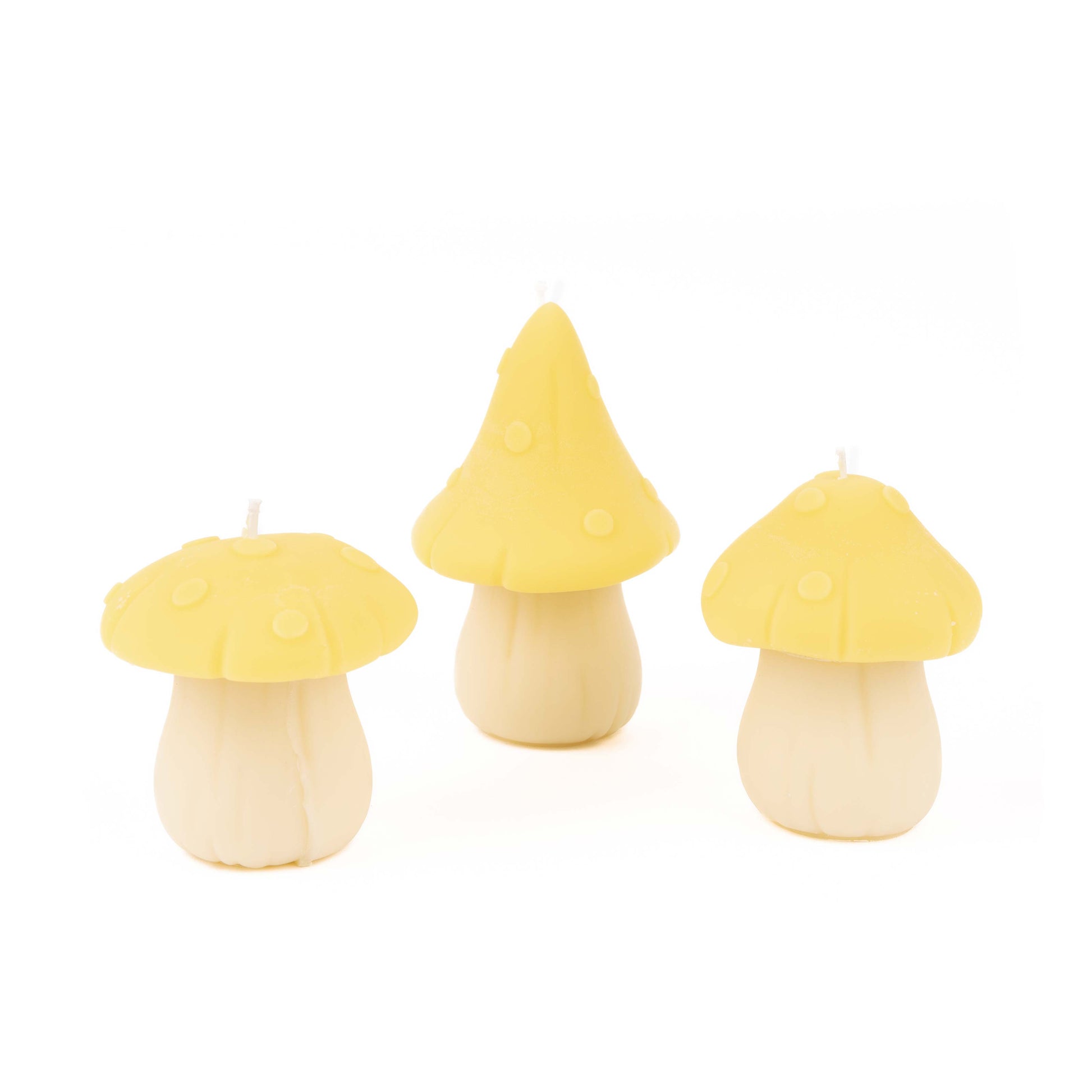 Illuminate your space with whimsical charm using our yellow mushroom soy wax pillar candle set of three. These handcrafted, pastel-hued mushroom-shaped candles create a cozy and enchanting ambiance. Made from eco-friendly soy wax, they offer a clean, long-lasting burn, making them perfect for any occasion.